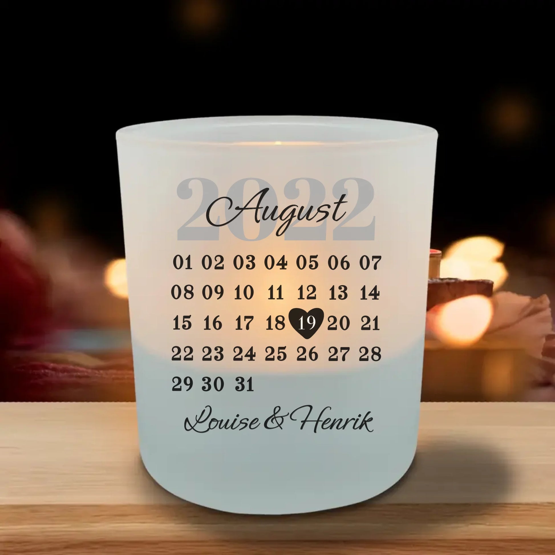 - Tryk: Højkvalitets og holdbart tryk, som fremstår let gennemsigtigt på det frostede glas og skaber en hyggelig lys effekt, når et fyrfadslys er tændt.